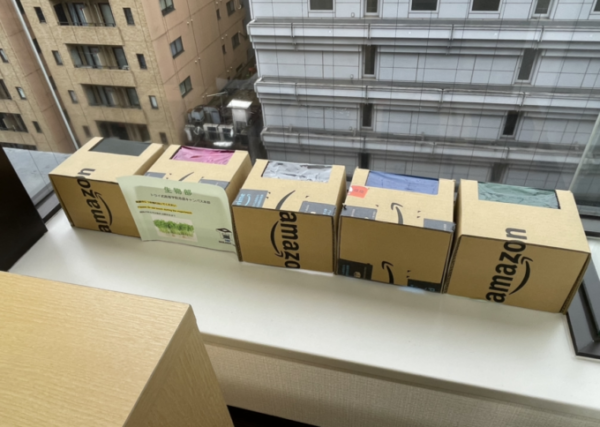 北西向きの池袋キャンパスの窓辺で、段ボールの家(箱)の中で育てられている豆苗たちです。