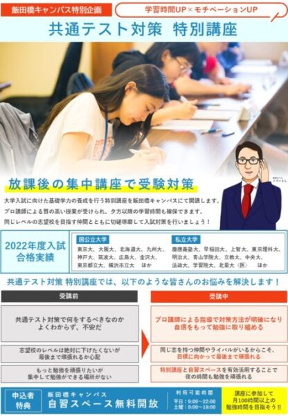 飯田橋キャンパスでは、共通テストに向け特別講座を開講します。