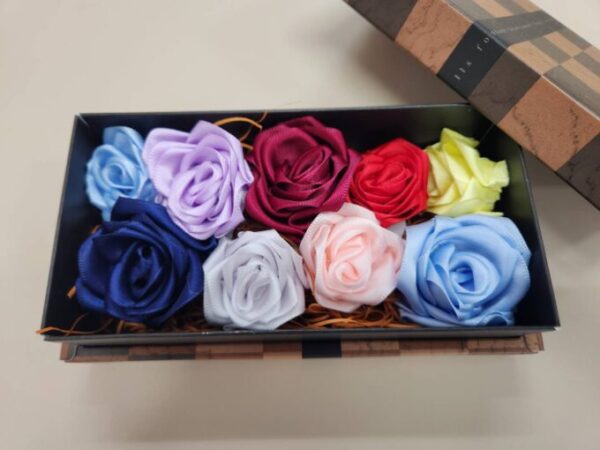 リボンをクルクル丸めてお花をつくり、ギフトボックスに詰めていきます🎁