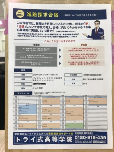 今回は 11/25(月)~28(木)に、ヴィラフォンテーヌグランド東京有明 有明コンファレンスセンターで行なわれる「★難関大★進路探求合宿」について、お知らせします📢