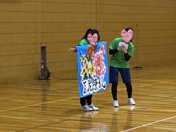 午前中が文化祭、午後から体育祭を開催し、文化祭ではダンスやバンド演奏、クイズなどで盛り上がりました。四日市キャンパスは体育祭のテーマである「百花繚乱」をイメージし素敵な旗を描いて発表しました。会場からは「綺麗!」「すごい!」などの声が上がっていました。