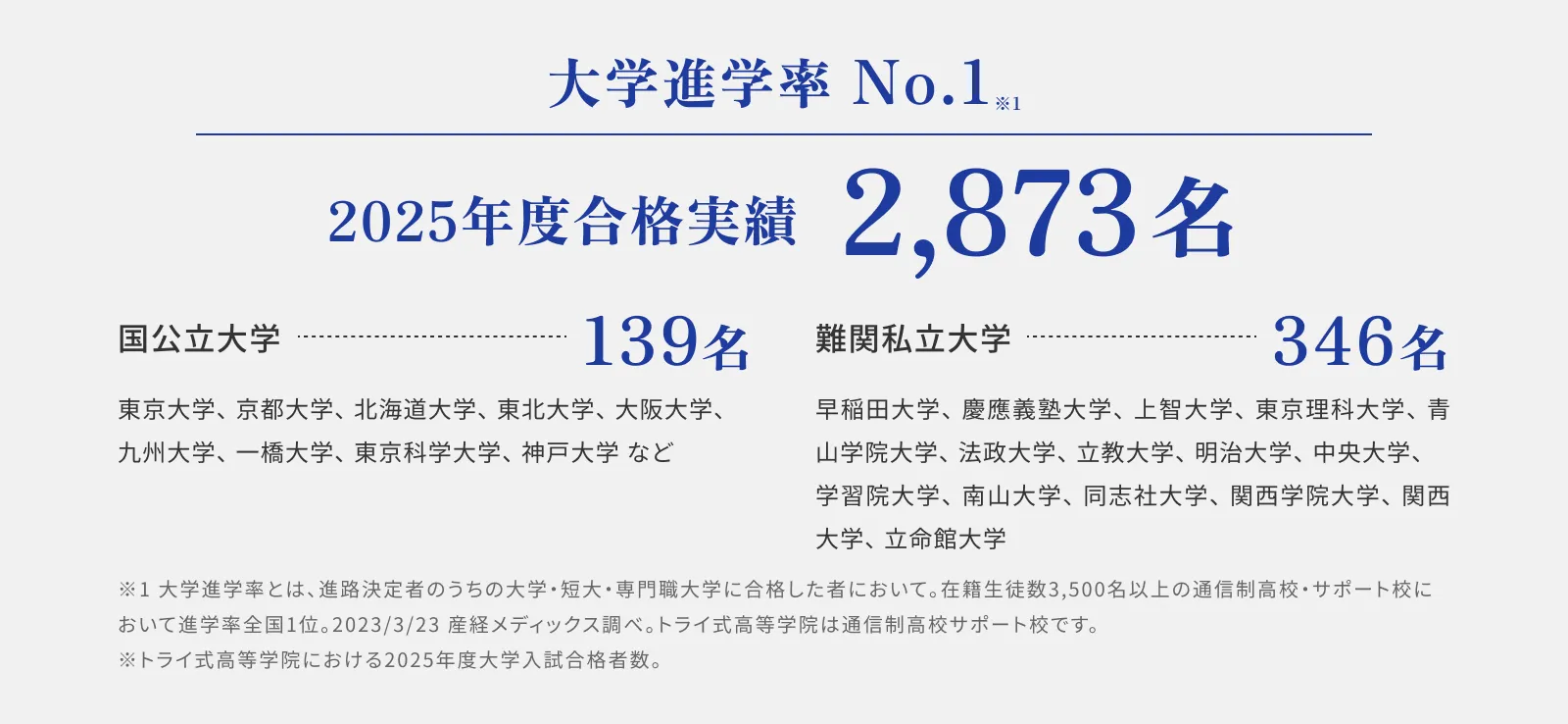 オーダーメイドカリキュラム×完全マンツーマン指導で志望校合格へと導きます。学力に不安のある方も、まずはトライ式高等学院にご相談ください。