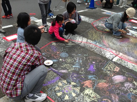 家では制限がありかけないけれど、今日は堂々と地面に落書きできる日だよと恥ずかしがる子供もちょっと強引にお誘いです!