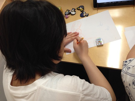 指導中は集団授業以外は1対1の個別指導となるので、ブース内での指導です。受験対策を行う生徒さんもいれば、音大目指して楽典の授業を選択している生徒さん、そしてイラストの指導を受ける生徒さんもいます。写真の生徒さんはキャラクターデザインを活躍中のプロの方について勉強しています。とっても上手で去年は出展した際に賞をいただいちゃってます!