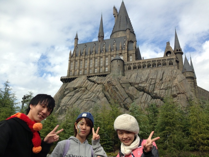 そしてついに、今話題のハリーポッターへ!!映画の世界に入ったようでみんなテンションが上がっていました♪♪ 残念ながら、アトラクションは90分待ちだったので諦めましたが、甘~いバタービールを飲んだり、お土産を買ったりして、みんな雰囲気を楽しみました(^v^)