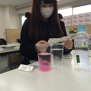 実験は次のような手順で進められました。2本のペットボトルの一方は水道水、もう一方には家庭用浄水器を通した水が入っていて、どちらがどちらか分からなくしてあります。それぞれを少量コップにとって、塩素の含有の差を試薬を使って確かめました。(塩素を含んでいればピンクに変色)。試薬を加えてかき混ぜると一方は透明のまま、もう一方はピンク色に変色しました。その後、伏せてあった文字を確かめると透明のほうが浄水器を通した水、ピンクに変色したほうが水道水でした。浄水器を通すと水道水に含まれていた塩素が取り除かれることが分かりました。教室ではしませんでしたが、ほんとうの実験では、最初に試薬が目的の作用をするかどうかの確認から始めるそうで、小さなことでもひとつずつ確認を取ってから次に進むという化学の基本的な姿勢を学ぶことがました。