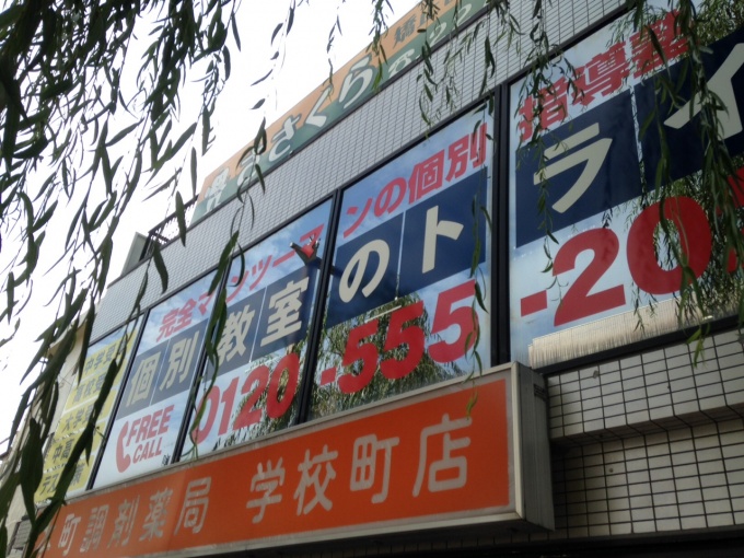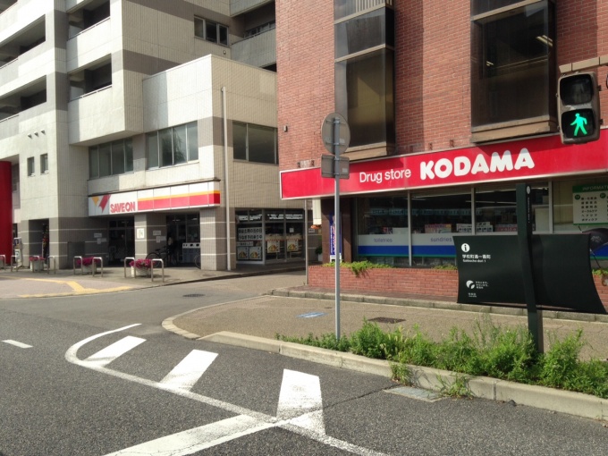 右手にコンビニエンスストアやドラッグストアが見えます。
