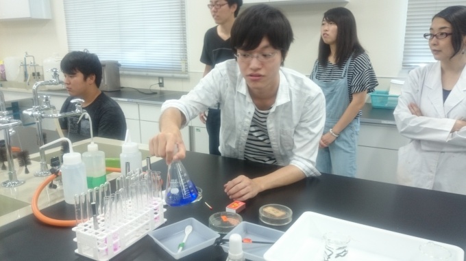 今回行ったのは「化学基礎」の科目から「イオン化傾向」についての実験でした。教員志望の学生さんが進行役となって、実際の授業のように実験のお手本や解説をしてくださいましたよ!
