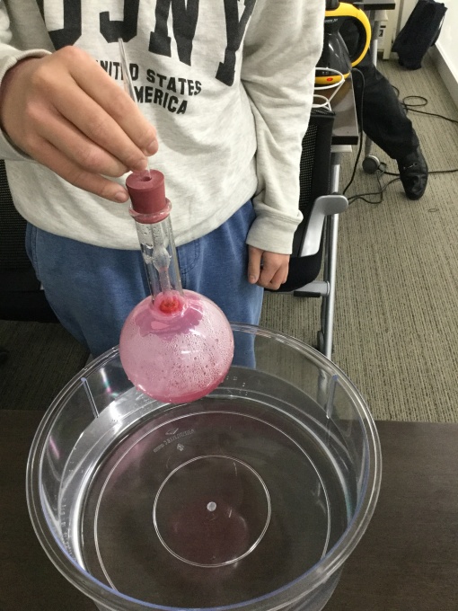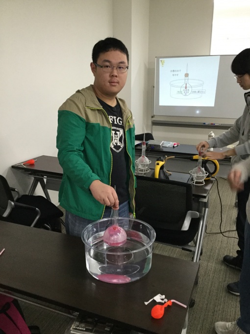 簡単な説明のあと、フラスコの中の空気を抜くことで風船を膨らませたり、噴水を起こしたり、空き缶をつぶしたり、雲を作ったり(?)しました。マッチを擦るのに苦戦する生徒もいましたが・・・協力して全員が全ての実験を成功することができました。