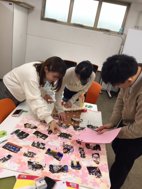 そこで会場を華やかに飾り、キャンパスの紹介も兼ねて桜の木のポスターを在校生で作成しています。