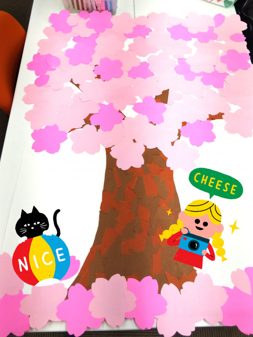 幹の部分は画用紙をちぎって切り絵風にしてみました。在校生の得Eちゃんがきれいに貼ってくれました。ありがとう☆☆桜の花びらも在校生とスタッフで一枚ずつ切ったものです。もくもくと切る作業が意外と楽しくて、たくさんの花びらができあがりました。