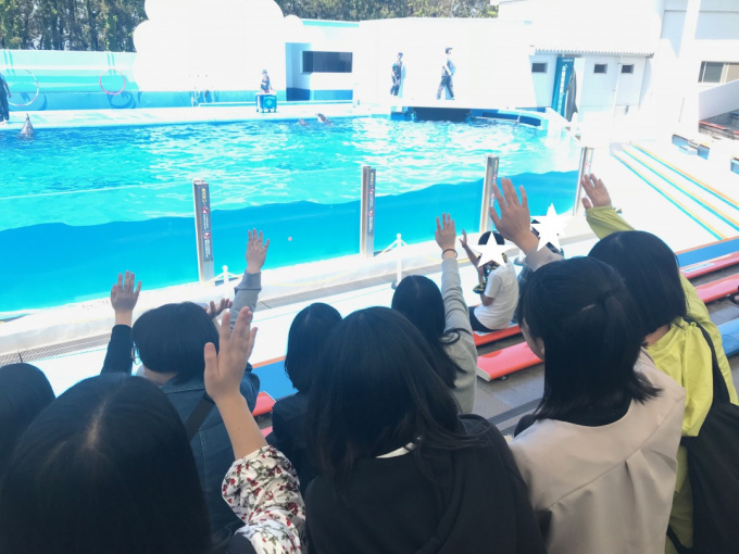 イルカショー参加に多くの生徒達が立候補しました。