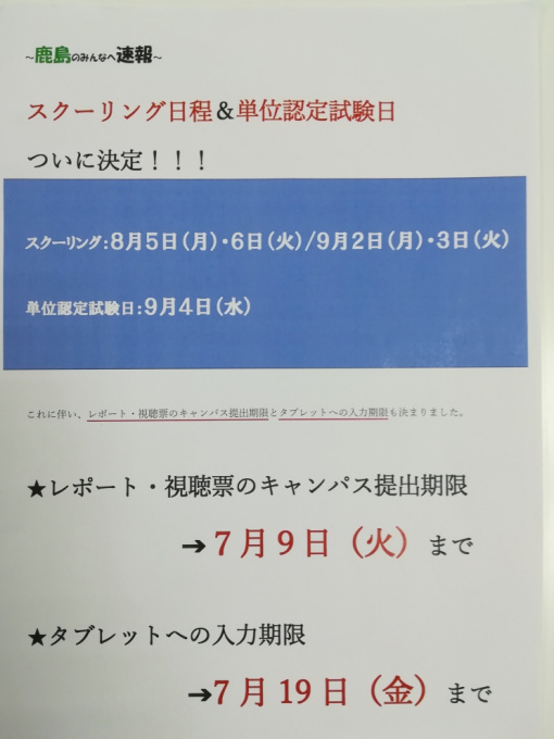 Ⅰ期のスクーリングと単位認定試験の日程が決まりました!