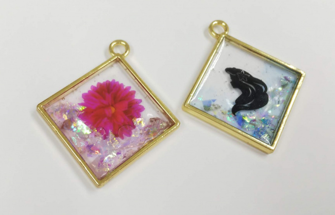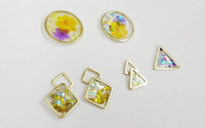 今回の内容はUVレジン液を使ったアクセサリー作りです。自己紹介をしたあとは各自もくもくと作業に入りました。道具や材料は限りがあるので、みんなで譲り合いながら作成を進めていました。みんな初めてなのにかわいい作品が出来上がりましたよ~!完成したアクセサリパーツがこちらです☆