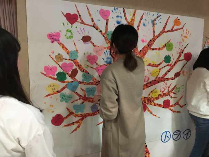 今回の文化祭のテーマは『Let’s Try!』ということで、文化祭の会場には生徒参加型のモニュメントが展示されており、手形や目標を書いた飾りをペタペタ・・。とっても華やかな作品になりました!