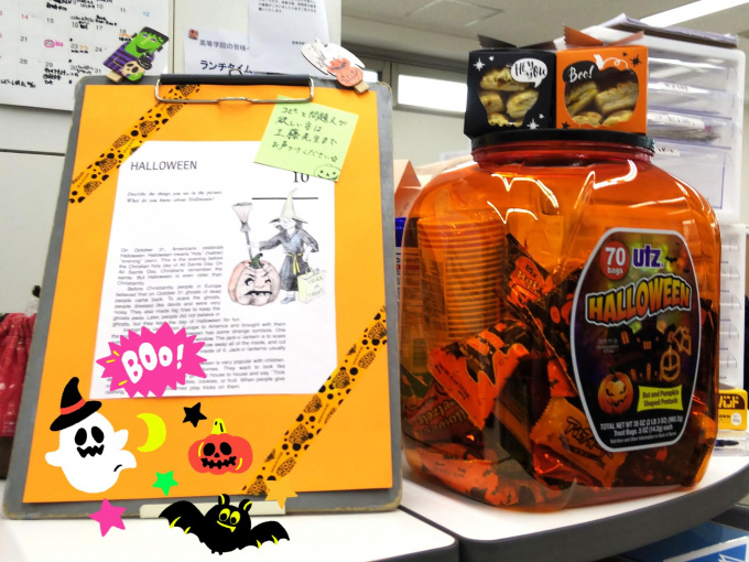こちらのハロウィンに関する英文は「生徒が読めるように」と工藤先生がコピーしてくださいました。3年生のDくんは「なるほどね」とさらっと読みこなしていました。さすが受験生・・・!