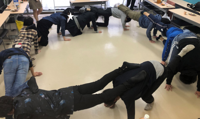 腕を床につき、後ろの人の肩に足を乗せるという大技に挑戦!!開始早々みんなヘトヘトになっていました(笑)