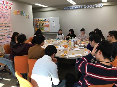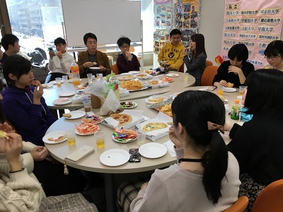 キャンパスでピザやお菓子を準備して、皆で楽しく話しながら楽しみました(^○^)