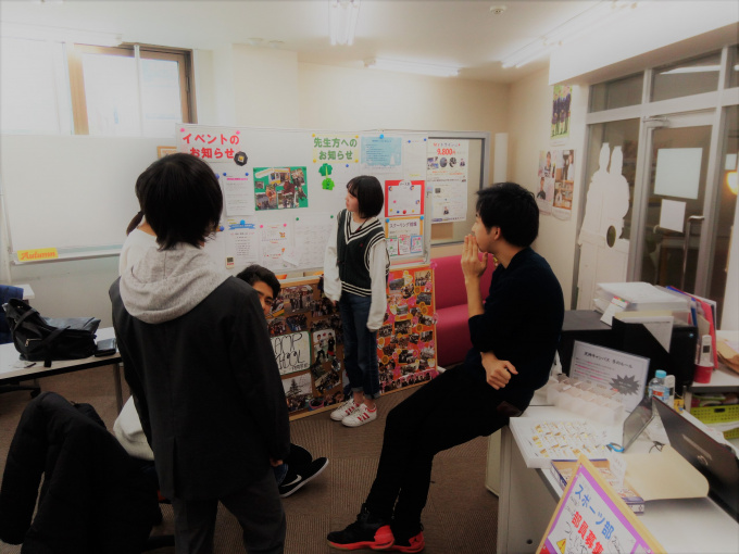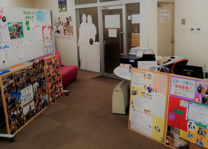 ホワイトボードには「イベントのお知らせ」や「先生方へのお知らせ」、