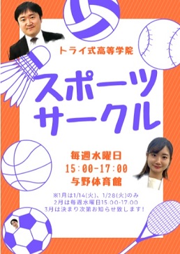 【持ち物】体育館履き・動きやすい服装・飲み物・汗拭きタオル