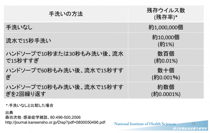 以下の表をご覧ください。これは手洗いの時間別の効果です。