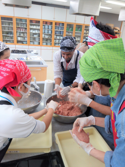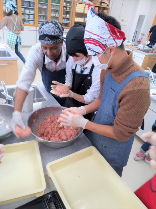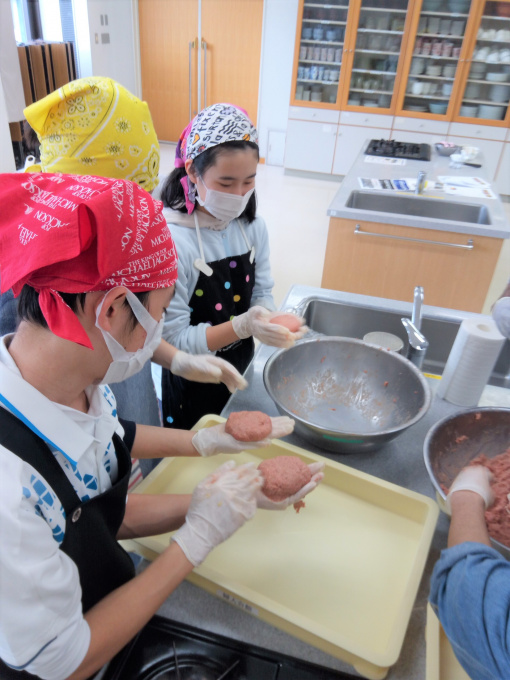 力と心を込めて具材をこねたハンバーグ班、次は成形の工程です。
