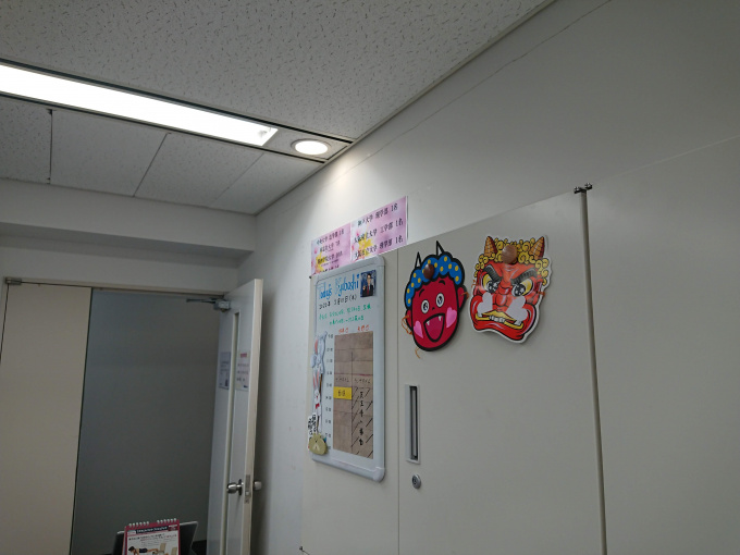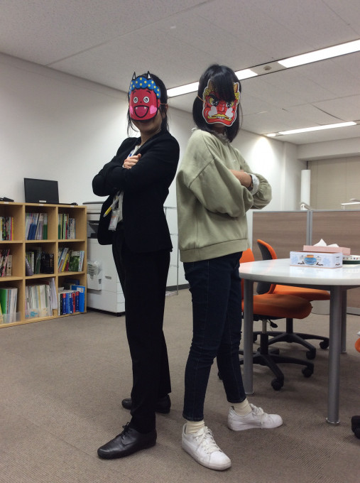 予定表のボードとともに鬼のお面でお出迎えしたり、