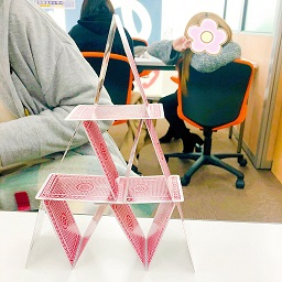 \トランプタワーに挑戦するMさん(高3)とYさん(高2)/
