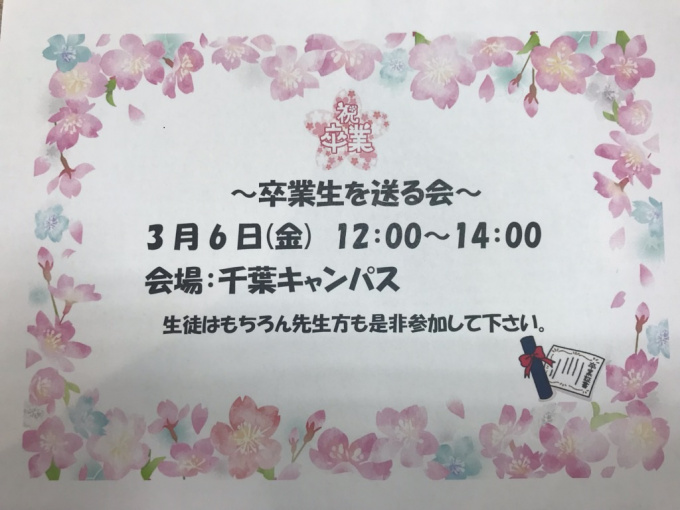 その後 千葉キャンパスにて”卒業生を送る会”を開催する予定です。