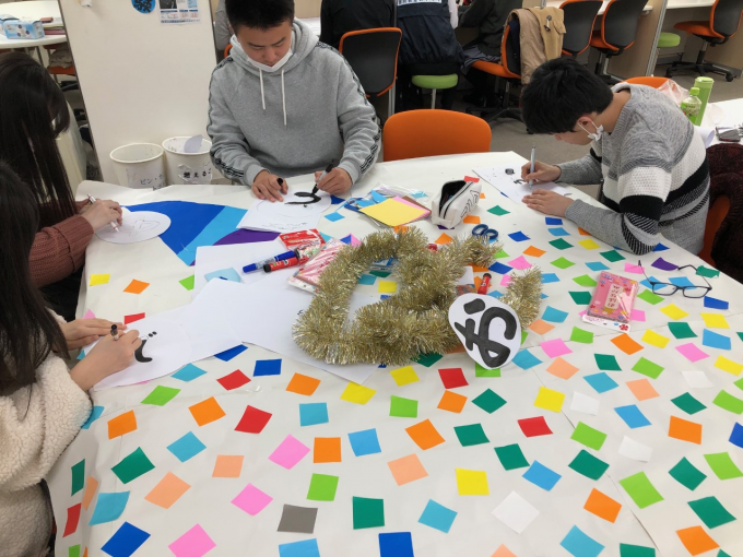 今日は折り紙を使ってクラッカーの色を塗ったり、文字を書いたりしました。文字を書くには苦労しましたね。私が一番下手でした(笑)
