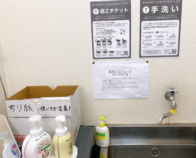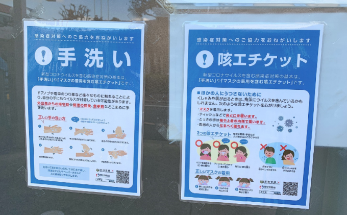 キャンパスの入り口と洗面所には手洗いと咳エチケットのよく見る掲示物。