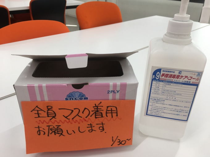 さて千種キャンパスでは新型コロナウィルス対策のため、出入り口の所には、マスクと消毒液を常備しております。