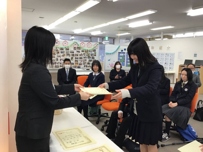 今回はキャンパスでの実施ということで、キャンパス長から直々に証書をお渡ししました。渡すキャンパス長も、受け取る生徒も緊張の様子・・(笑)でも練習の成果もあって、みんなばっちりでした(^^)