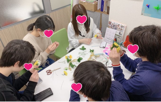 100均の小道具で、卒業生の胸に着けてもらうコサージュを作ったり