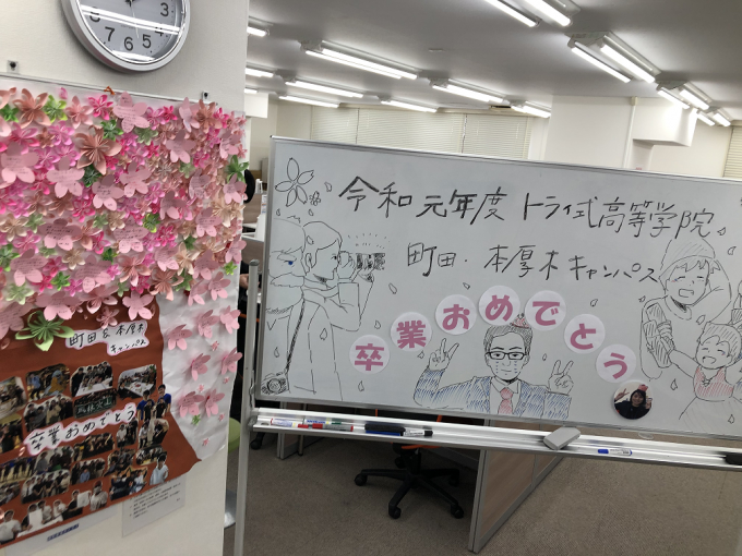 桜の掲示物は町田キャンパスのスタッフさん、生徒さんが作ってくださり