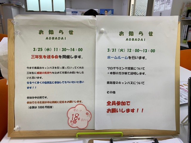 「送る会」開催時間帯以外の授業は通常通り行い、その他は振替で対応させて頂きます。