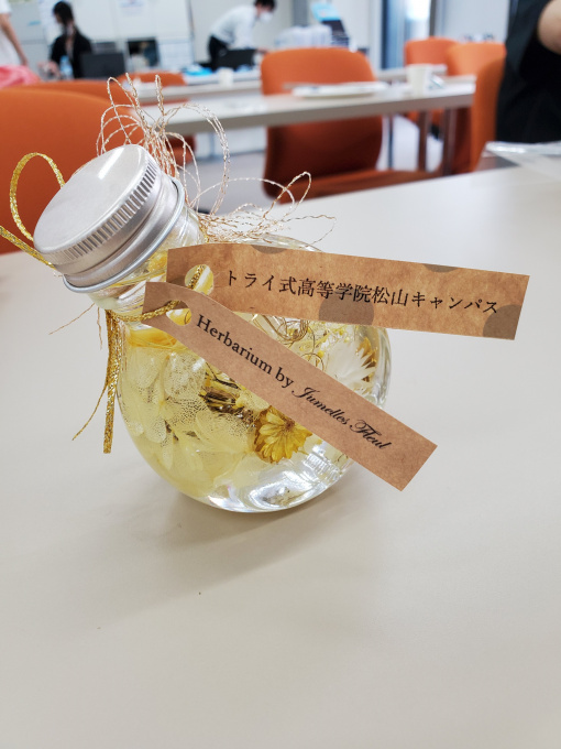 - 初めてハーバリウムをして上手くはいきずらかったけど、とても楽しかったです。完成形を見たらとてもきれいなのでやってよかったなと思いました。話しながら作ったり教えてもらいながらやれて良かったです。
