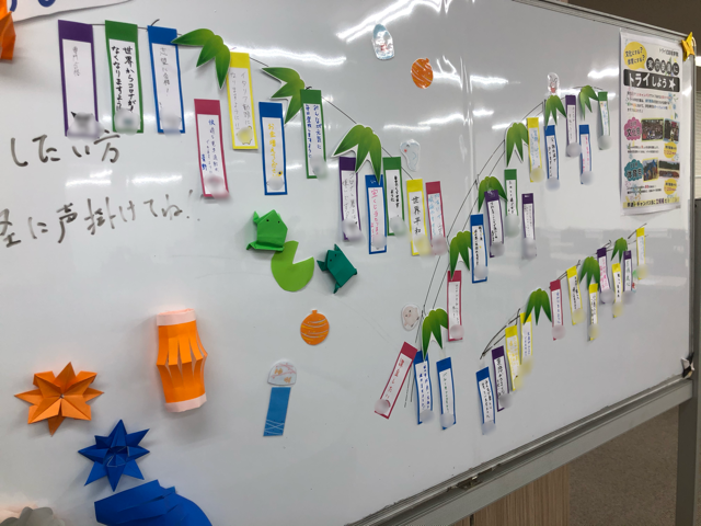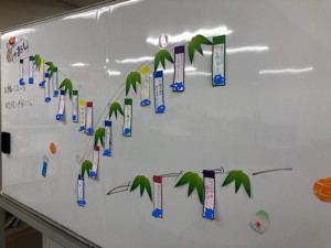 姫路キャンパスでは、生徒から七夕だからお願い事をしようと提案があり登校した生徒や先生に短冊を渡して
