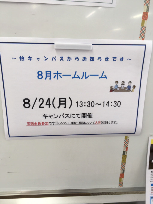 さて、毎月恒例のホームルームですが、8/24(月)13:30から開催します。