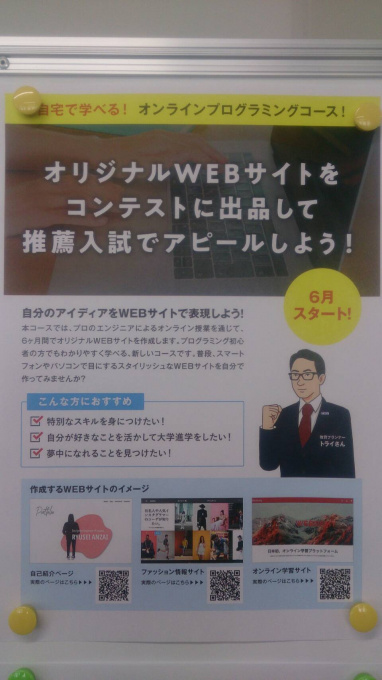 トライ式高等学院ではKOOVを使ったプログラミングの基礎学習を以前より行っておりましたが、1対1授業においてもオンラインでの受講環境整備等が進み、『マンツーマンでのプログラミング授業』によるそれぞれの習熟度に応じて学べるコースや『プログラミングコース』としてチームを作り全国WEBコンテスト(ホームページを作成)に出品するコースなど、学べる環境を整えております。