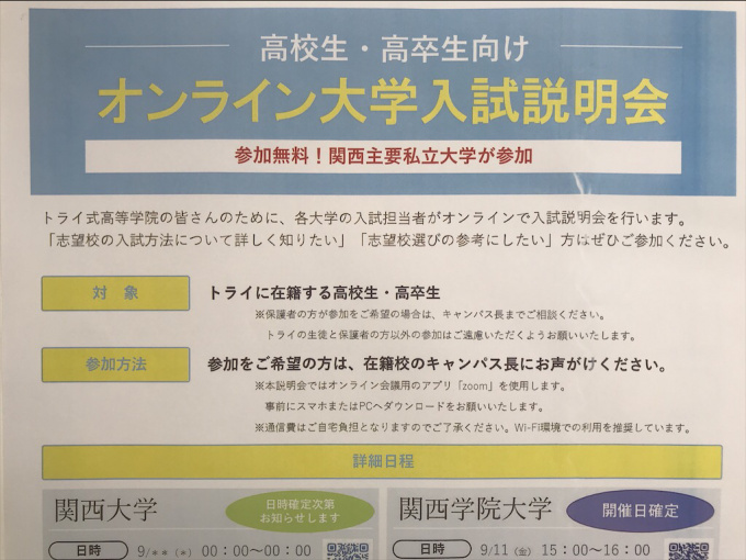 関西の主要大学にご協力いただき、トライ式高等学院のみなさんのために、入試担当者がオンラインで入試説明を行ってくださいます。