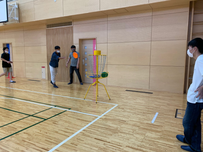 担当講師によるより詳しいコースの説明を聞き、模擬授業としてフライングディスクに挑戦!
