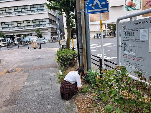 街路樹のあたりを中心に、清掃活動を行い、空きビンやペットボトル、紙くず、ごみ袋などを拾いました。