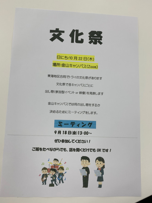 出し物の案として二つのプランにまとめ、9月18日(金)13時から行われる金山キャンパス全体のミーティングでまとめた案を発表する予定です。