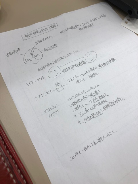 NVC(ノンバーバルコミュニケーション)トレーニングとは、言葉以外の「仕草」「表情」「声のトーン」などのコニュニケーションのこと。どうすれば相手に伝わるのか、効果的な使い方などを学びました。