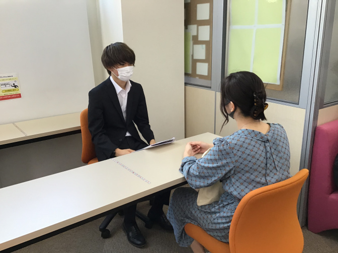 推薦入試には必ず面接があるので本日は生徒同士が「面接官役」「受験生役」になってお互いの面接態度や話す内容を評価し合っています。