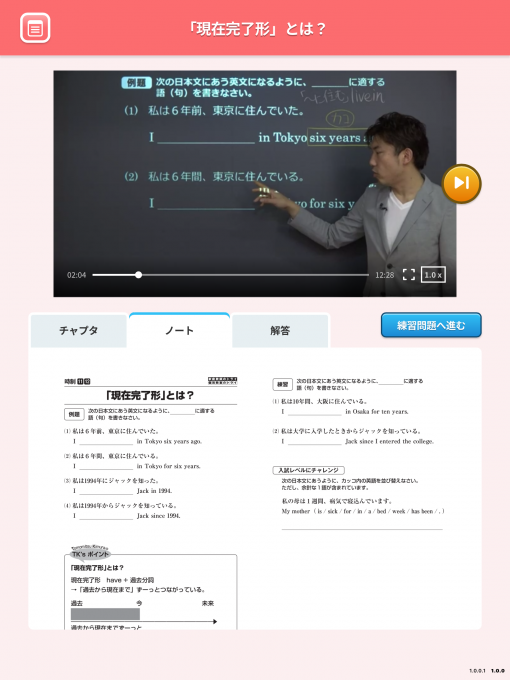 次に選択した単元の映像授業を視聴します。解説をまとめた「ノート」もあるので速度が速いと思った場合でも安心!