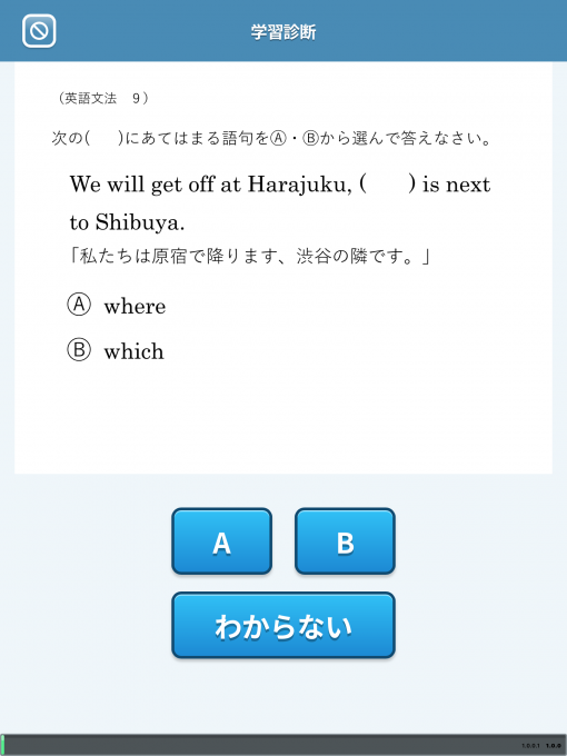 これは現時点で各科目の理解度をAIが診断します。問題が復習出題されますが全て【A】【B】【わからない】の3択なので安心して下さいね。
