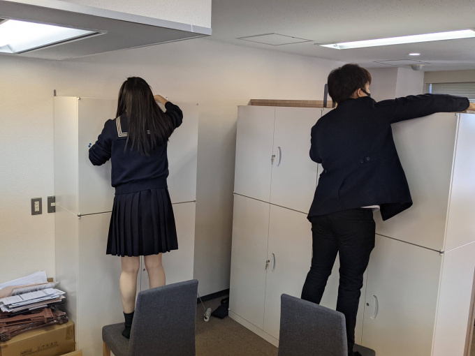 女子は本棚の整理。初めましての生徒同士も、掃除を通じて仲良しになってました。