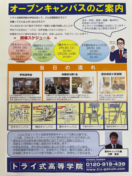 茨木キャンパスでは月に2回ほどオープンキャンパスを開催させて頂いています。